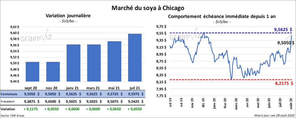 Les contrats de soya US ont fini la session en hausse entre 8 ½ et 9 ¼ cents. Celui septembre 20 a terminé avec un gain de 13 ¼ cents. Les contrats de tourteau de soya US aux échéances les plus rapprochées ont clôturé en progression de plus de 6,70 $/tonne. Le contrat d’huile de soya US septembre 20 a terminé la journée dans le vert. Sur la semaine, il a progressé de 1,98 cents/lb.