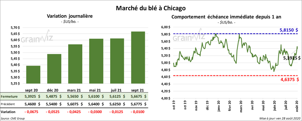Les contrats de blé US ont principalement terminé la journée avec des pertes. À Kansas, les contrats de blé ont clôturé entre une baisse d’une fraction de cent et une hausse d’un cent. Les contrats de blé tendre rouge d’hiver US ont clôturé dans le rouge d’une fraction à 3 ¼ cents. Ceux de blé dur rouge de printemps ont fermé la session en baisse de 1 à 4 ¼ cents. Le contrat de septembre 20 a été le plus faible.