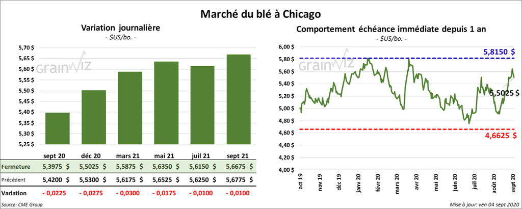 - CFTC : Au 1er septembre dernier, à Chicago, les spéculateurs actifs dans le blé avaient augmenté leurs positions nettes acheteuses de 30,952 contrats à 32,469 contrats. À Kansas, ils ont fait de même en virant leurs positions en positions nettes acheteuses de 3,160 contrats à un total de 24,276 contrats.