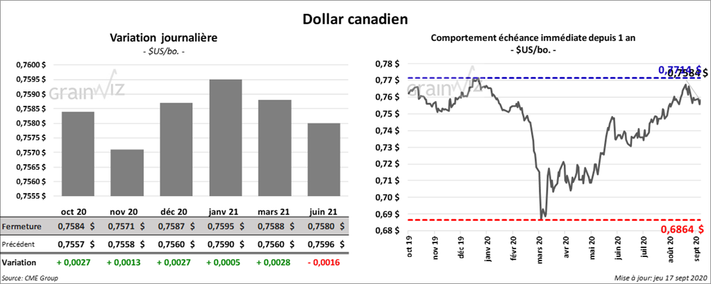 Les contrats de soya US ont terminé principalement en hausse par 2 chiffres. Celui novembre 20 a clôturé avec un gain de 17 ¼ cents. Ceux différés ont fini la journée en progression de 3 ¾ à 9 ½ cents. Les contrats de tourteau de soya US ont terminé avec des gains entre 8,50 $ à 9,60 $/tonne. Le contrat d’huile de soya US octobre 20 a clôturé en baisse de 3 cents.