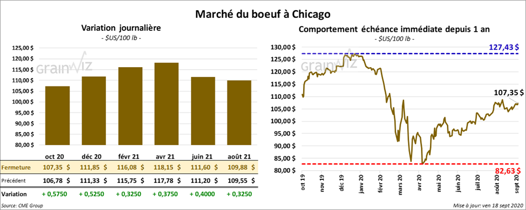 - Le 17 septembre dernier, le CME Feeder Cattle Index était en hausse de 97 cents à 142,18 $.