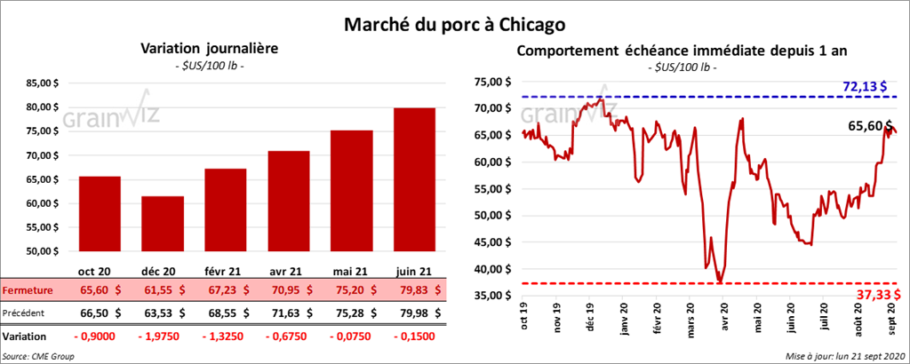 - Le 17 septembre dernier, le CME Lean Hog Index était en progression de 1,74 $ à 69,58 $.