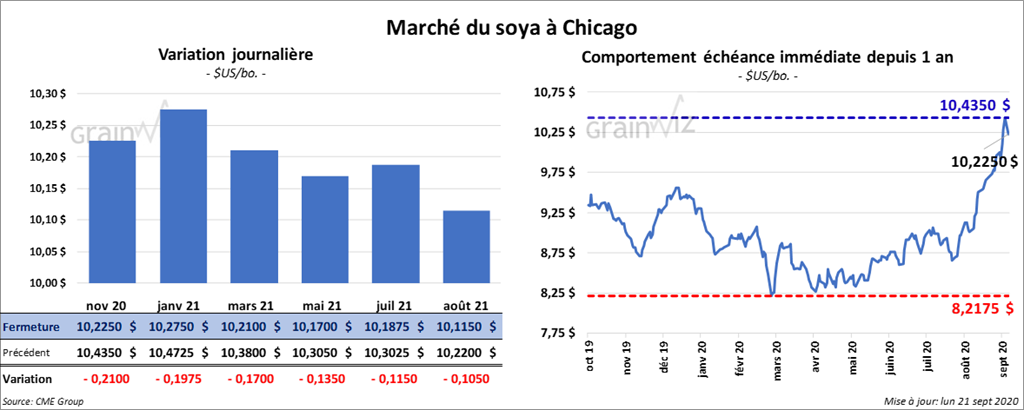 Les contrats de soya US ont commencé la semaine avec des pertes. Celui novembre 20 a perdu 21 cents alors que les autres contrats ont fini dans le rouge entre 10 ½ et 19 ¾ cents. Les contrats de tourteau de soya US ont terminé en baisse de 4 $/tonne. Ceux d’huile de soya US ont perdu entre 2,45 % et 2,72 %.