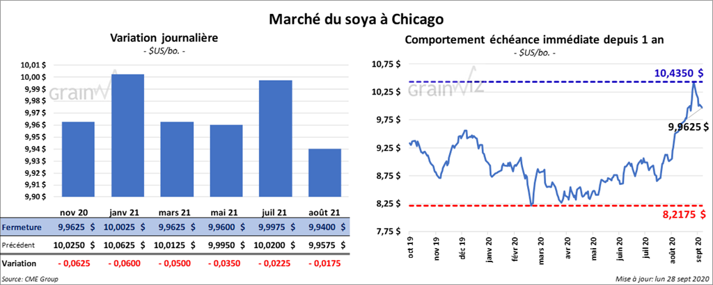 Les contrats de soya US ont fini la journée en baisse de 1 ¾ à 6 ¼ cents. Ceux de tourteau de soya US ont également clôturé dans le rouge par 4,30 $/tonne. Les contrats d’huile de soya US ont fait l’inverse en terminant la session avec des gains entre 25 et 45 points.