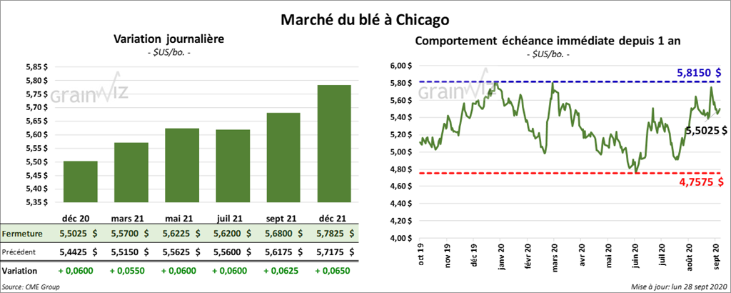 Les contrats de blé d’hiver US ont fini la séance en hausse, mais pas ceux de blé de printemps US. À Chicago, les contrats de blé ont terminé en progression de 5 ½ à 6 ¼ cents. Ceux de blé dur rouge d’hiver US ont clôturé avec des gains de 7 ¼ à 7 ½ cents. Les contrats de blé de printemps US ont clôturé en baisse d’une fraction à un cent.