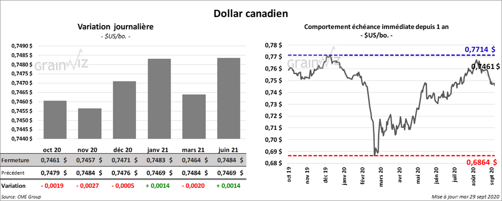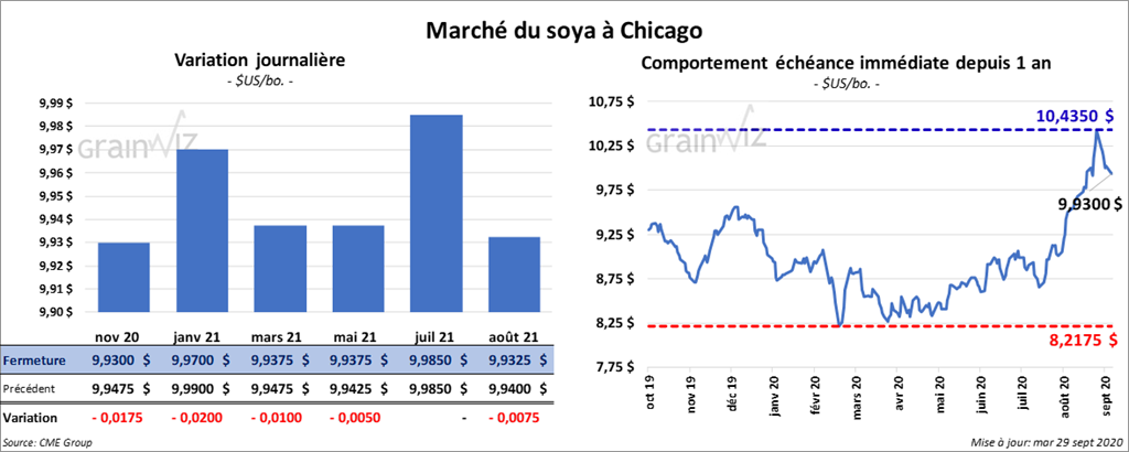 À la fermeture du marché, les contrats de soya US étaient dans le rouge de ¾ à 3 ¼ cents. Les contrats de tourteau de soya US ont fait de même en clôturant en baisse de 1 $ à 5,30 $/tonne.