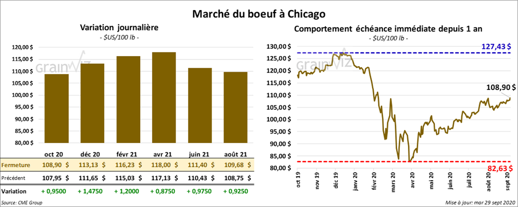 - Le 28 septembre dernier, le CME Feeder Cattle Index était en baisse de 25 cents à 142,36 $.