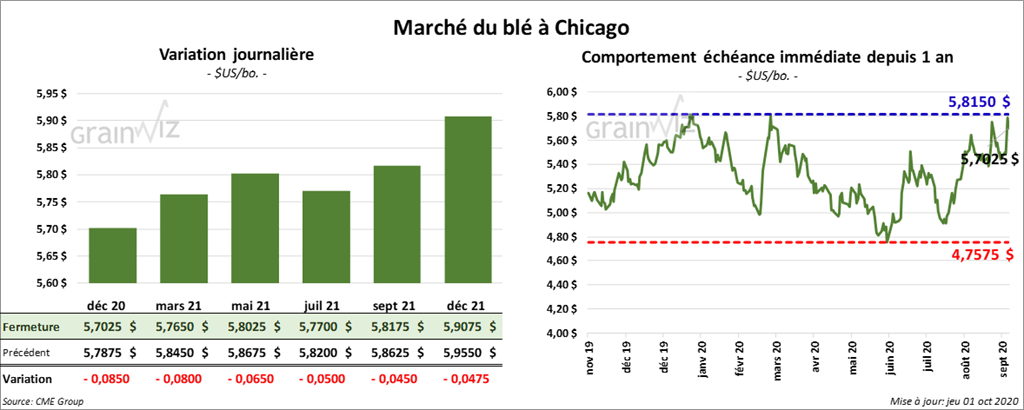 À Chicago, les contrats de blé ont fini la séance en baisse de 5 à 7 cents. À Kansas, ils ont terminé en recul de 2 ¾ à 3 cents. À Minneapolis, les contrats de blé ont clôturé dans le rouge entre 3 ¾ et 6 ¾ cents.