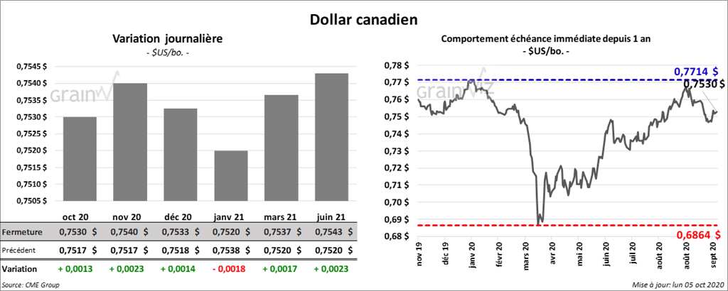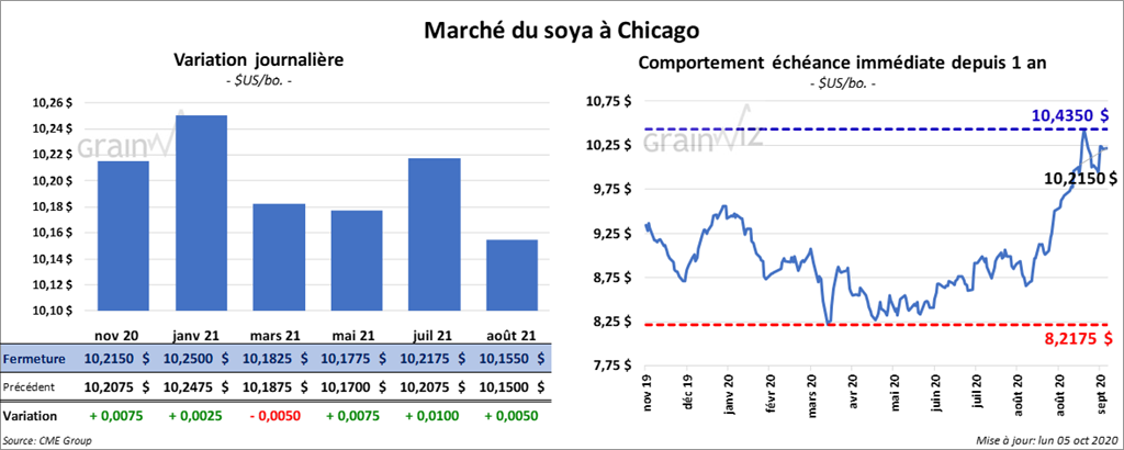 Les contrats de soya US ont fini principalement en hausse. Le contrat mars 21 a clôturé en baisse de ½ cent alors que les contrats aux échéances les plus rapprochées ont terminé avec des gains d’un cent. Les contrats de tourteau de soya US ont fini la séance en baisse de 5,30 $ à 5,90 $/tonne. Ceux d’huile de soya US ont terminé en hausse de 2,7 % à 2,84 %.