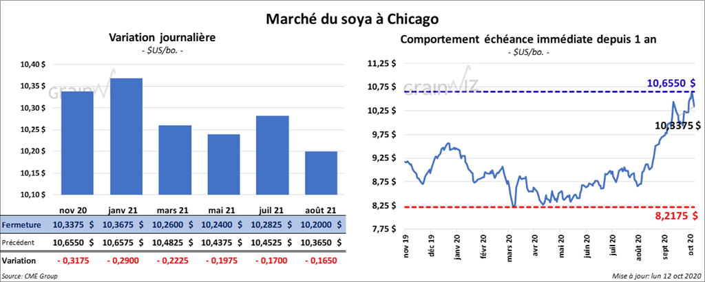 Les contrats de soya US ont fini dans le rouge entre 16 ½ et 31 ¾ cents. Ceux de tourteau de soya US ont également terminé la session en baisse de 9,40 $ à 8,10 $/tonne. Les contrats d’huile de soya US ont clôturé en recul de 81 à 85 points.