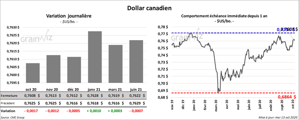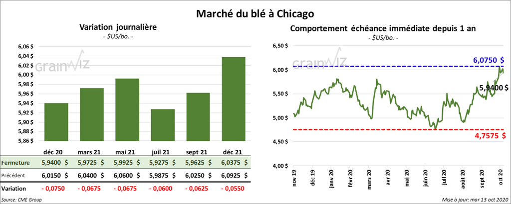 À Chicago, les contrats de blé ont terminé la session en baisse d’une fraction à 2 ¼ cents, avec une chute plus prononcée pour ceux de 2021/2022. À Kansas, les contrats de blé ont fini en hausse d’une fraction de cent à 2 cents. À Minneapolis, les contrats de blé ont également fermé dans le vert d’une fraction de cent à 1 ½ cents.