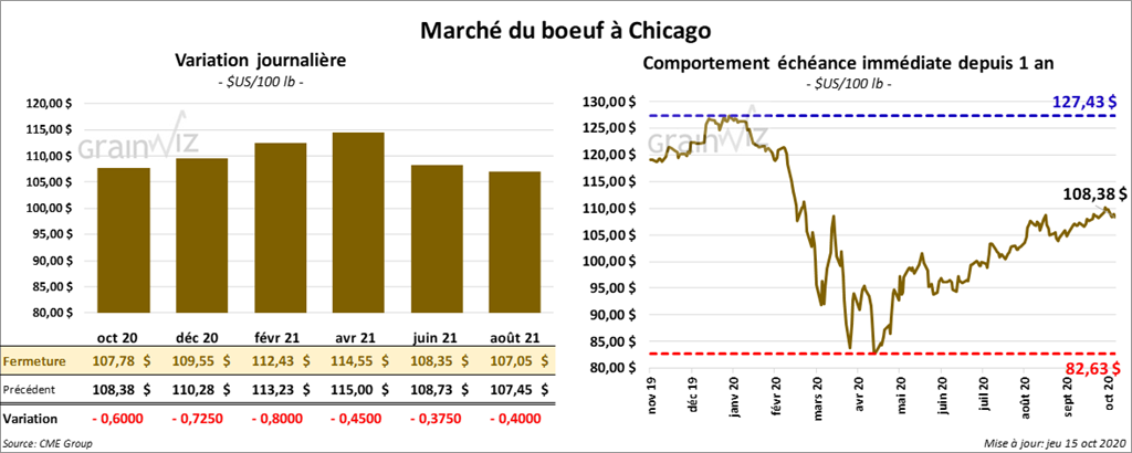 À la fin de la session, les contrats de bœuf US étaient en baisse de 37 à 80 cents. Ceux de veau US échéant en 2020 ont terminé la journée avec des gains entre 15 et 55 cents. Toutefois, les contrats différés ont clôturé dans le rouge par 3 chiffres.