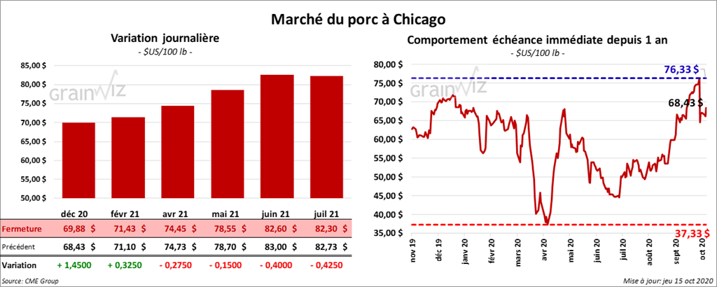 Les contrats de porc US décembre 20 et février 20 ont terminé la séance avec des gains par 3 chiffres. Cependant, les contrats différés ont fini en baisse.