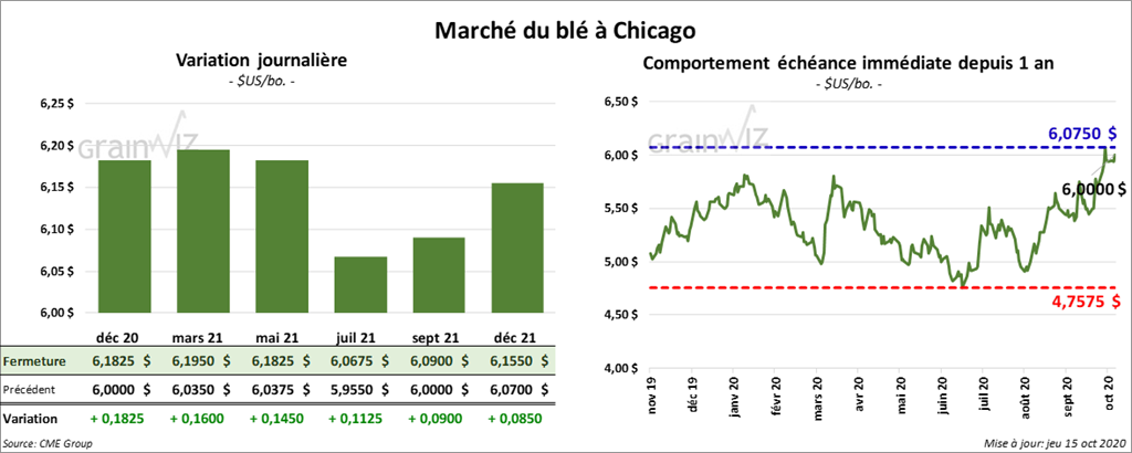 Les contrats de blé US ont terminé la journée dans le vert. À Kansas, ils avaient progressé de 3,24 % à 4,25 %. À Chicago, les contrats de blé US ont également fini en hausse de 1,75 % à 3,6 %. À Minneapolis, ceux de blé de printemps US ont clôturé avec des gains entre 10 ¼ et 12 ¾ cents.