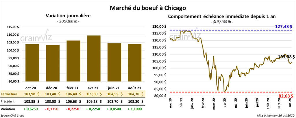 Les contrats de bœuf US ont fini la journée en progression partagée. Le contrat décembre 20 a clôturé dans le rouge de 18 cents. Les contrats de veau US ont terminé avec des gains entre 92 cents et 1,22 $.