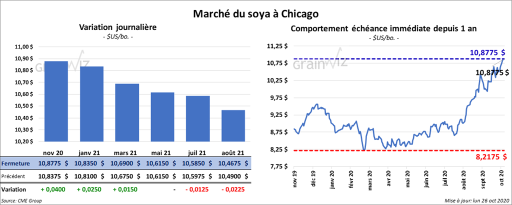 Les contrats de soya US aux échéances les plus rapprochées ont terminé la session en hausse de 4 cents. Ceux différés ont clôturé dans le rouge entre 1 ¼ à 2 ¼ cents. Les contrats de tourteau de soya US ont fini en progression de 2,10 $ à 3,50 $/tonne. Ceux d’huile de soya US ont terminé la journée en hausse de 19 à 35 points.