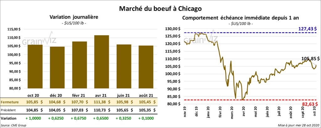 - L’USDA a rapporté des ventes au comptant entre 101 $ et 106,25 $. Par contre, il a noté des ventes de 988 têtes à 101,54 $.