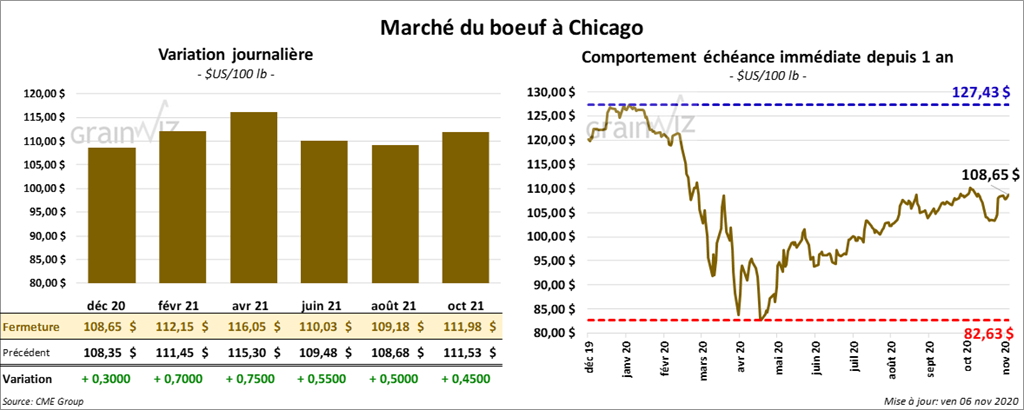 Le contrat de porc US décembre 20 a terminé la journée en baisse de 2,53 $. Celui février 21 a clôturé avec une perte de 1,45 $. Par contre, les contrats aux échéances les plus éloignées ont fermé en hausse de 22 à 85 cents.