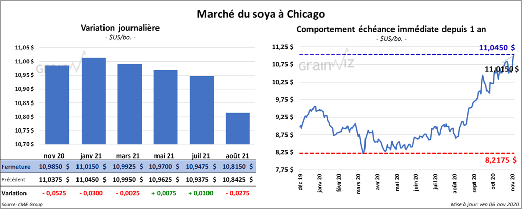 Le contrat de maïs US décembre 20 a terminé la session en baisse de 2 ½ cents, mais les contrats échéant en 2021 ont fini la journée avec des gains.