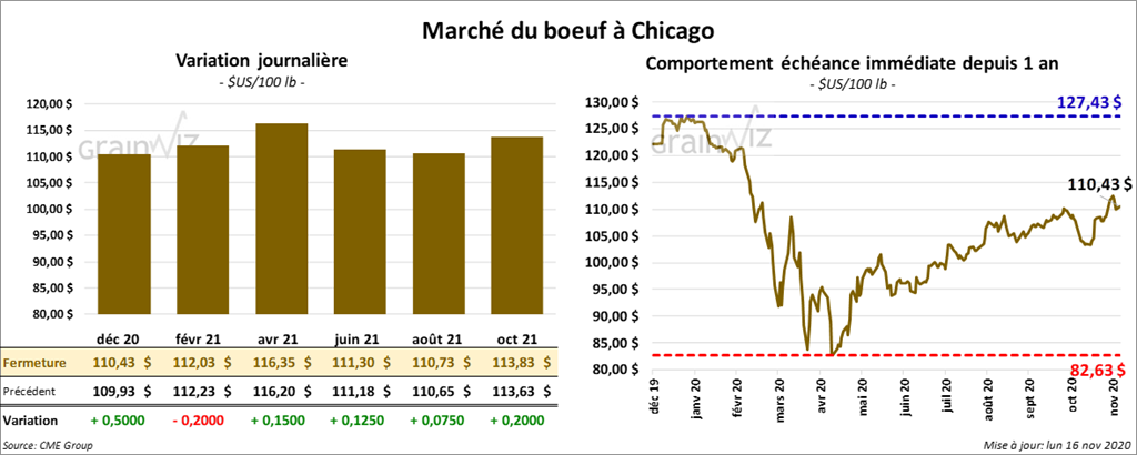 - Le 12 novembre dernier, le CME Feeder Cattle Index était en hausse de 65 cents à 137,35 $.