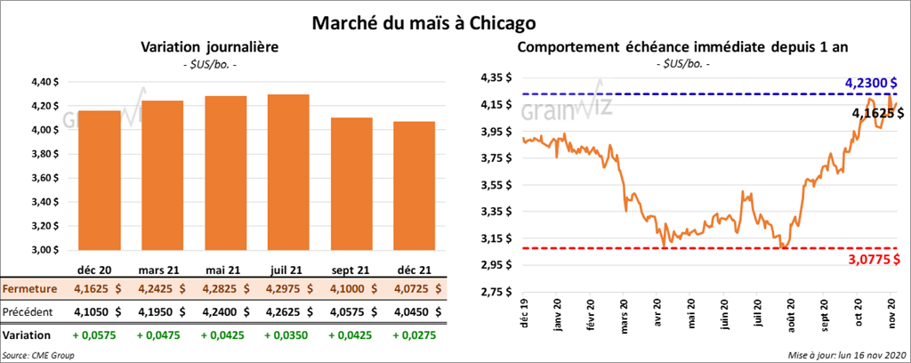 - CFTC : En raison du congé du Veterans Day, la publication du rapport du CoT a été faite aujourd’hui. Il indique que le 10 novembre dernier, les gestionnaires de fonds spéculatifs actifs dans le maïs US avaient réduit leurs positions nettes acheteuses de 9,245 contrats à 280,835 contrats.