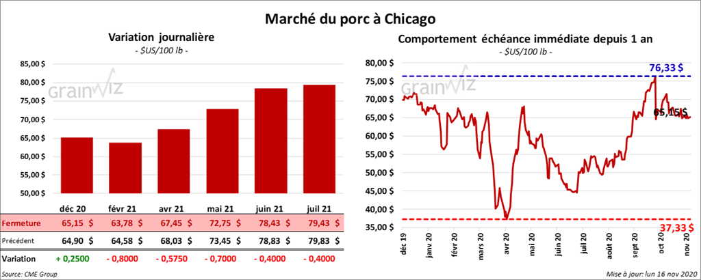 - Le 12 novembre dernier, le CME Lean Hog Index a été en recul de 48 cents à 70,84 $.