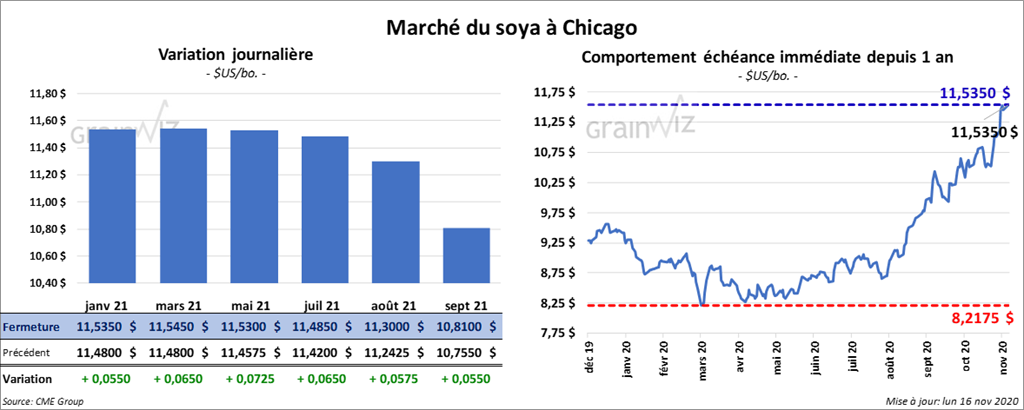 Les contrats de soya US ont fini la journée avec des gains de 5 à 7 ¼ cents. Ceux de tourteau de soya US ont suivi la même direction en terminant en hausse de 1,20 $ à 2,10 $/tonne. Les contrats d’huile de soya US ont fermé dans le vert entre 30 et 33 points.