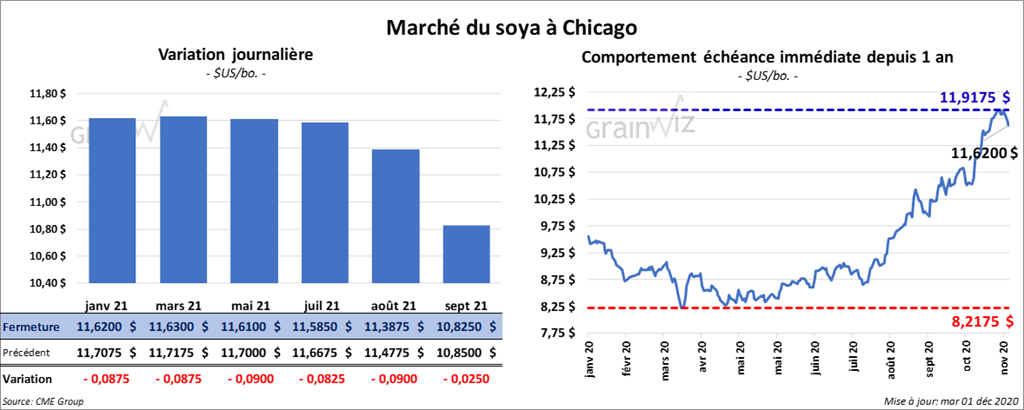 Les contrats de soya US aux échéances les plus rapprochées ont terminé la session en baisse de 8 ¼ à 9 cents. Le contrat de tourteau de soya US janvier 21 a clôturé dans le rouge de 90 cents/tonne. Ceux d’huile de soya US ont clôturé en recul de 1,1 % à 1,28 %.