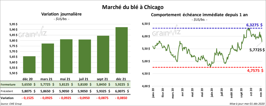 À Chicago, les contrats de blé aux échéances les plus rapprochées ont fermé en baisse de 9 ¼ à 9 ½ cents. À Kansas, les contrats de blé dur rouge aux échéances les plus rapprochées ont terminé la journée en recul entre 7 ¾ et 8 cents. À Minneapolis, les contrats de blé de printemps ont terminé la session en recul de 3 ½ à 4 ½ cents.