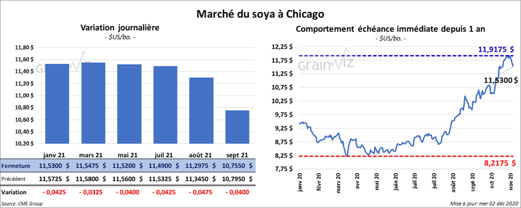 Les contrats de soya US aux échéances les plus rapprochées ont fini en recul de 3 ¼ à 4 ¾ cents. Le contrat de tourteau de soya US janvier 21 a clôturé dans le rouge de 3,10 $/tonne. Ceux d’huile de soya US ont également terminé en baisse de 9 points.