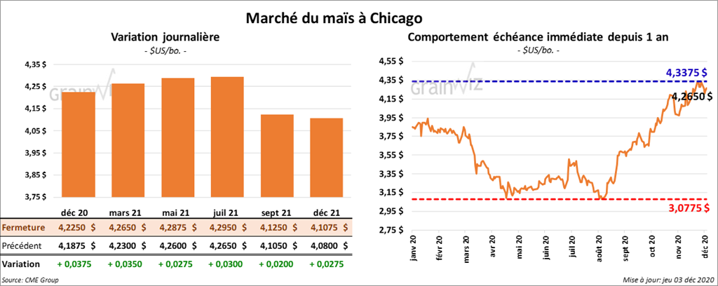- Au cours de la semaine du 26 novembre dernier, les ventes nettes à l’exportation de maïs US 2020/21 ont été de 1,371,400 tonnes, ce qui correspondait à une réduction de 18 % par rapport à la semaine précédente et à une baisse de 14 % comparativement la moyenne des 4 dernières semaines. Le Mexique et les destinations inconnues ont été les principaux acheteurs. Les anticipations des analystes étaient entre 800,000 et 1,6 millions de tonnes.