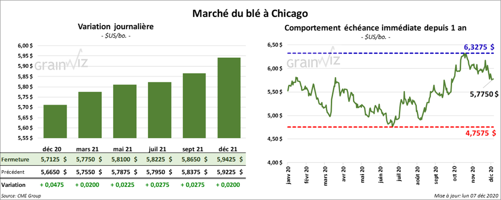 À Chicago, les contrats de blé aux échéances les plus rapprochées ont fini la journée en hausse de 2 à 2 ¾ cents. À Kansas, ceux de blé dur rouge aux échéances les plus rapprochées ont terminé la session en progression de 1 ½ à 2 ¾ cents. À Minneapolis, les contrats de blé de printemps aux échéances les plus rapprochées ont clôturé baisse de ¼ à 1 ¾ cents. Le contrat septembre 21 a fait l’inverse en terminant dans le vert de ½ cent.
