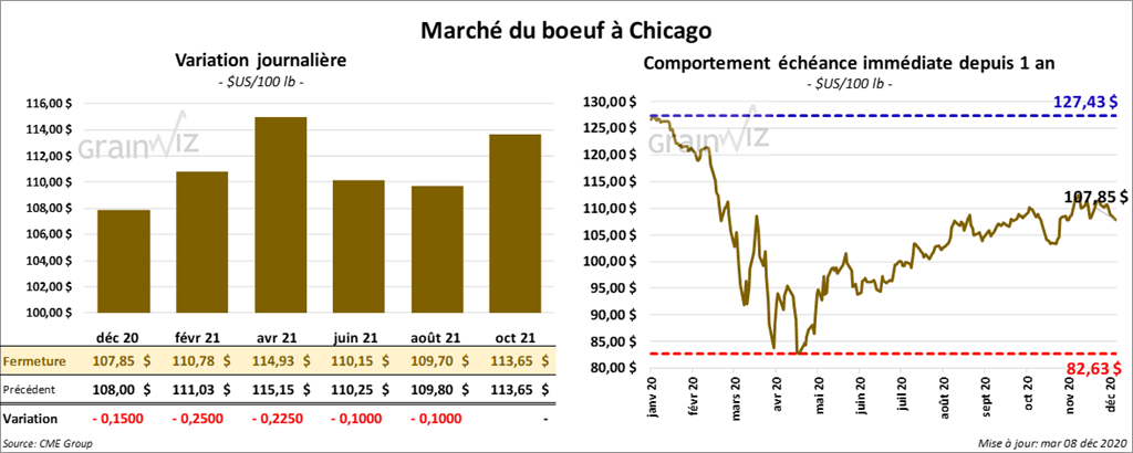 Les contrats de bœuf US aux échéances les plus rapprochées ont fermé en baisse de 10 cents à 25 cents. Ceux de veau US aux échéances les plus rapprochées ont fait l’inverse en terminant en hausse de 35 à 60 cents. Le contrat janvier 21 a fait exception en finissant en baisse de 22 cents.