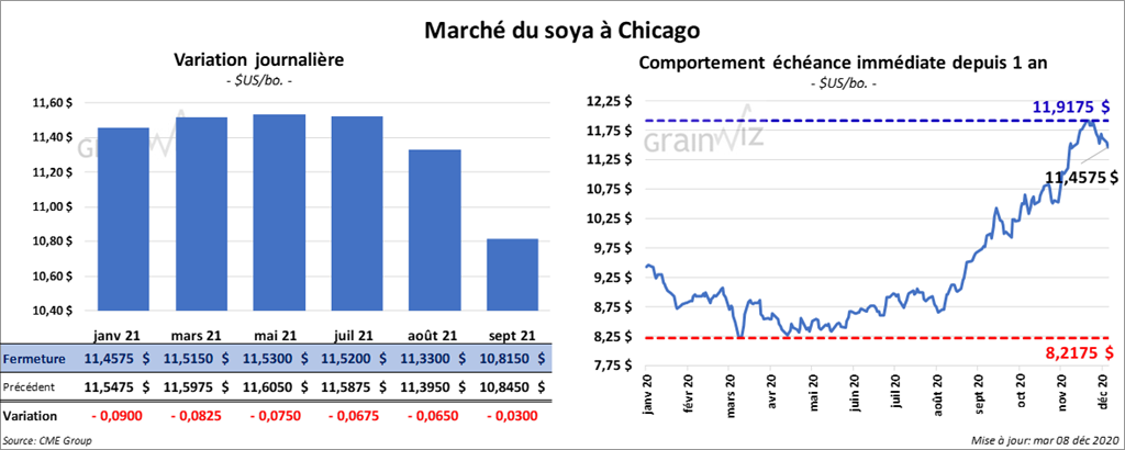 Les contrats de soya US aux échéances les plus rapprochées ont terminé la session en baisse entre 6 ¾ et 9 cents. Ceux de tourteau de soya US aux échéances les plus rapprochées ont fini en recul de 4,10 $ à 5,40 $/tonnes. Les contrats d’huile de soya US ont également clôturé dans le rouge entre 52 et 59 points.