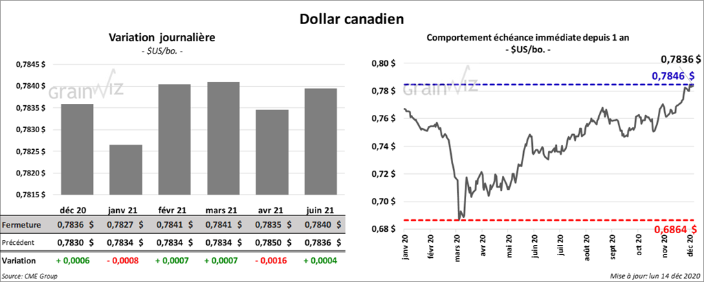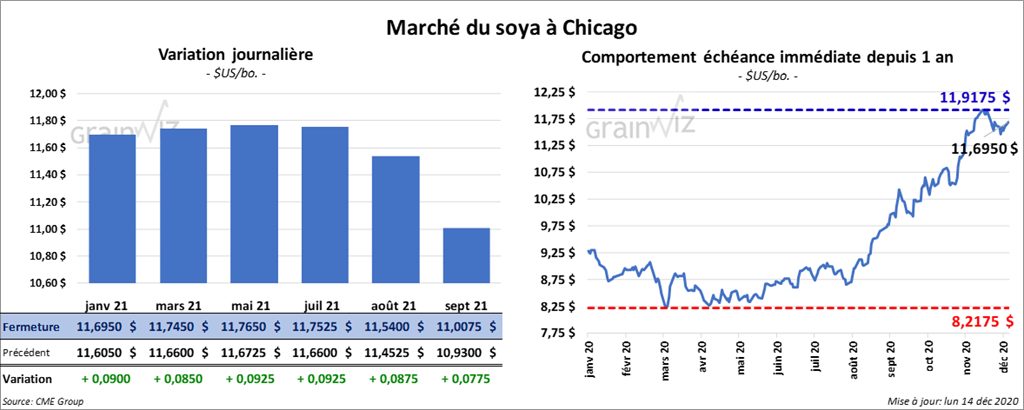 - Demain, le NOPA devrait présenter son rapport mensuel. Les analystes croient en moyenne que les membres de l’organisme ont trituré 180,025 millions de boisseaux au cours du mois de novembre dernier. Il s’agit en fait d’une baisse comparativement au mois d’octobre, mais aussi d’une augmentation par rapport à novembre 2019. Les inventaires d’huile de soya US sont anticipés à 1,548 milliard de lb.