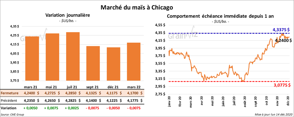 Les contrats de maïs aux échéances les plus rapprochées ont terminé la session en hausse de ¼ à ¾ cent. Le contrat septembre 21 a fait exception en finissant en baisse de ¾ cent.