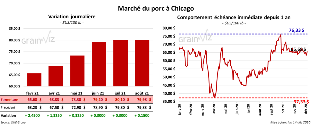 - Le 10 décembre dernier, le CME Lean Hog Index était en recul de 26 cents à 65,35 $.