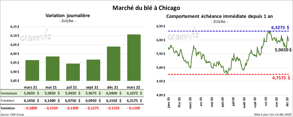 À Chicago, les contrats de blé ont fini la journée en baisse de 12 ¾ à 18 cents. À Kansas, les contrats de blé dur rouge ont terminé la session en baisse de 15 ¾ à 19 cents. À Minneapolis, les contrats de blé de printemps aux échéances les plus rapprochées ont clôturé dans le rouge entre 10 ¾ à 12 ½ cents.