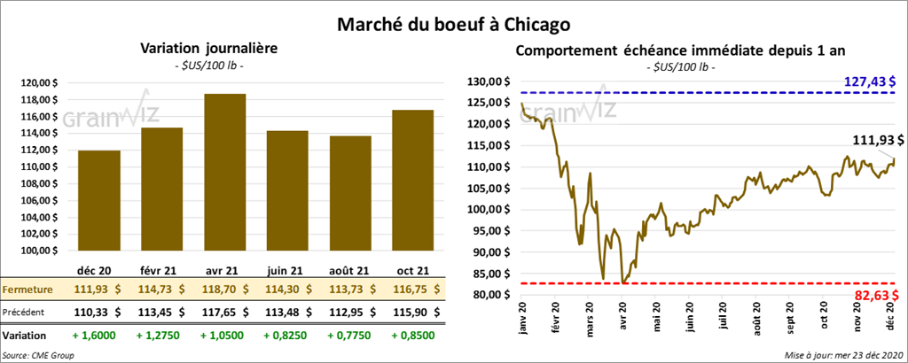 Les contrats de bœuf US aux échéances les plus rapprochées ont fermé en hausse entre 77 cents et 1,27 $. Ceux de veau US aux échéances les plus rapprochées ont aussi terminé la journée dans le vert entre ¾ et 50 cents.