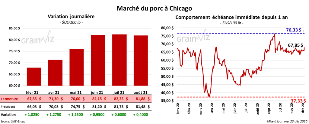 - Le 21 décembre dernier, le CME Lean Hog Index était en baisse de 51 cents à 62,04 $.