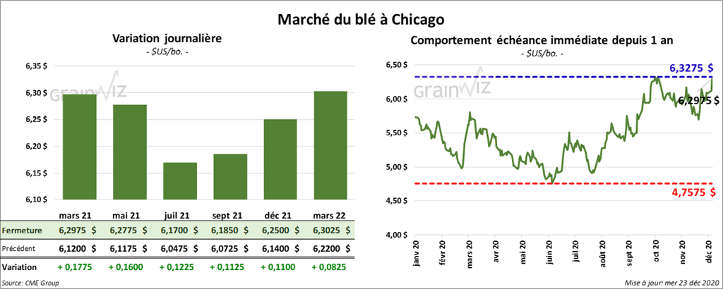 À Chicago, les contrats de blé aux échéances les plus rapprochées ont fini la session en hausse entre 11 ¼ et 17 ¾ cents. À Kansas, ceux de blé dur rouge aux échéances les plus rapprochées ont clôturé avec des gains entre 7 ¼ et 8 ¾ cents. À Minneapolis, les contrats de blé de printemps aux échéances les plus rapprochées ont terminé la journée en hausse entre 6 ½ et 8 ¼ cents.