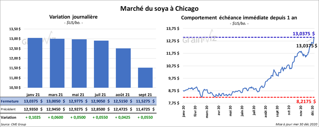 Les contrats de soya US aux échéances les plus rapprochées ont fermé avec des gains entre 4 ¼ et 10 ¼ cents. Ceux de tourteau de soya US aux échéances les plus rapprochées ont terminé la session en hausse entre 1,20 et 5,40 $/tonne. Les contrats d’huile de soya US aux échéances les plus rapprochées ont clôturé dans le vert entre 11 et 19 points.