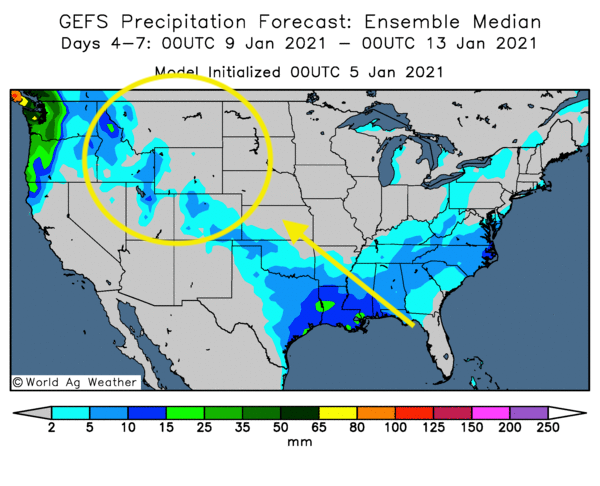 Cette carte des 4 à 7 prochains jours montre les zones de production de blé d'hiver US où les conditions sont sèches