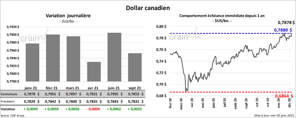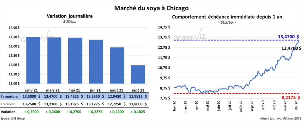 Les contrats de soya US aux échéances les plus rapprochées ont fini la journée en hausse entre 22 et 27 cents. Ceux de tourteau de soya US aux échéances les plus rapprochées ont suivi la même direction en terminant dans le vert entre 5,20 et 8,20 $/tonne. Les contrats d’huile de soya US aux échéances les plus rapprochées ont clôturé avec des gains entre 3,33 % et 3,49 %.