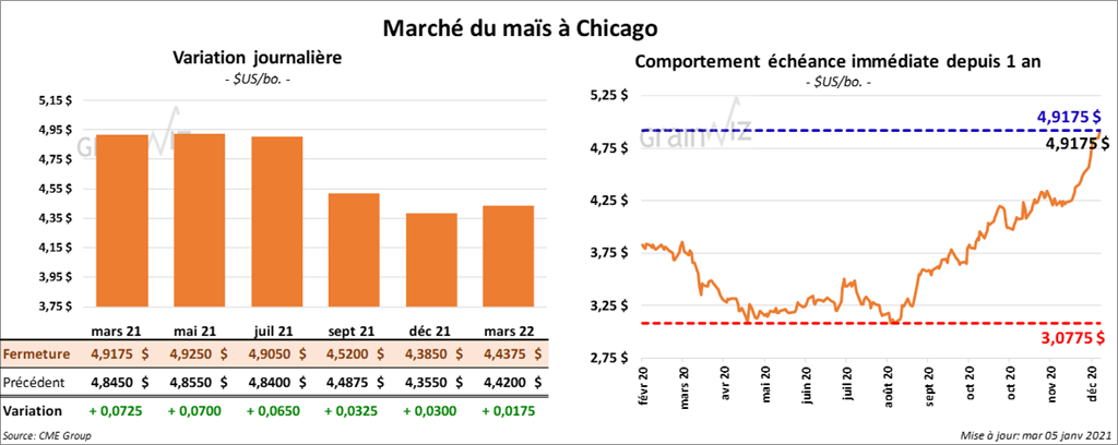 Les contrats de maïs US aux échéances les plus rapprochées ont terminé la session avec des gains entre 3 ¼ et 7 ¼ cents.