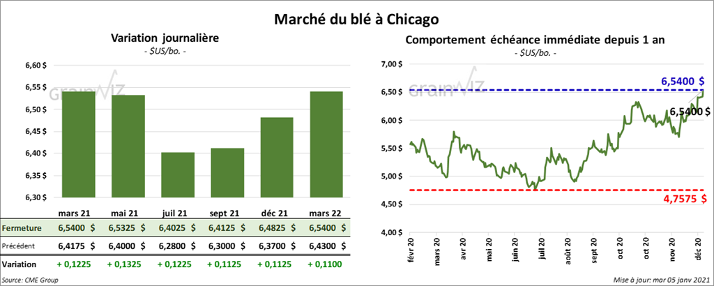 À Chicago, les contrats de blé aux échéances les plus rapprochées ont fini la session en hausse entre 11 ¼ et 12 ¼ cents. À Kansas, les contrats de blé dur rouge aux échéances les plus rapprochées ont terminé la journée avec des gains entre 9 ¼ et 9 ¾ cents. À Minneapolis, ceux de blé de printemps aux échéances les plus rapprochées ont clôturé dans le vert entre 7 ½ et 8 ¼ cents.