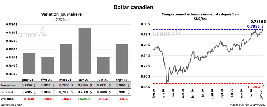 - Le 12 janvier prochain, l’USDA va présenter son rapport mensuel sur l’offre et la demande. Pour le mois de janvier, les analystes s’attendent à une production de maïs US de 14,470 milliards de boisseaux, avec un rendement de 175,3 boisseaux par acre. De plus, ils estiment que les stocks de fin d’année de maïs US pourraient avoisiner les 1,599 milliard de boisseaux, ce qui serait une baisse de 6 % par rapport à décembre dernier. Mondialement, les analystes prévoient des inventaires de fin d’année à 283,53 millions de tonnes, soit une baisse de 1,9 % comparativement à décembre 2020.