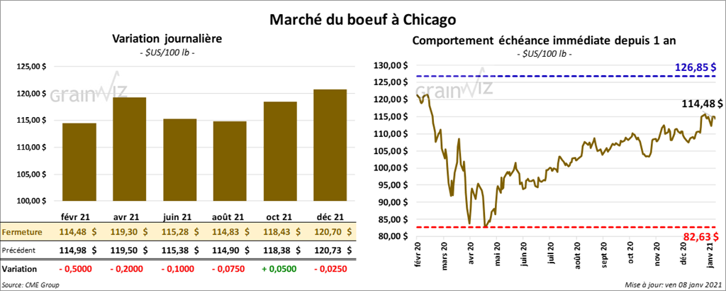 Les contrats de bœuf US aux échéances les plus rapprochées ont terminé la journée avec des pertes entre 7 et 50 cents. Quant au veau US, ceux aux échéances les plus rapprochées ont aussi clôturé dans le rouge entre 52 et 75 cents.