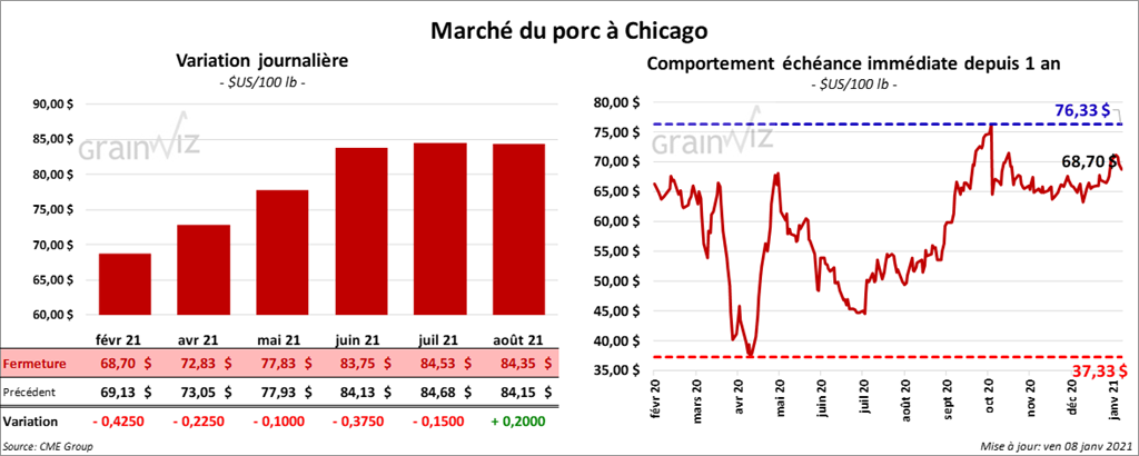 - Le 6 janvier dernier, le CME Lean Hog Index était en hausse de 54 cents à 62,96 $.