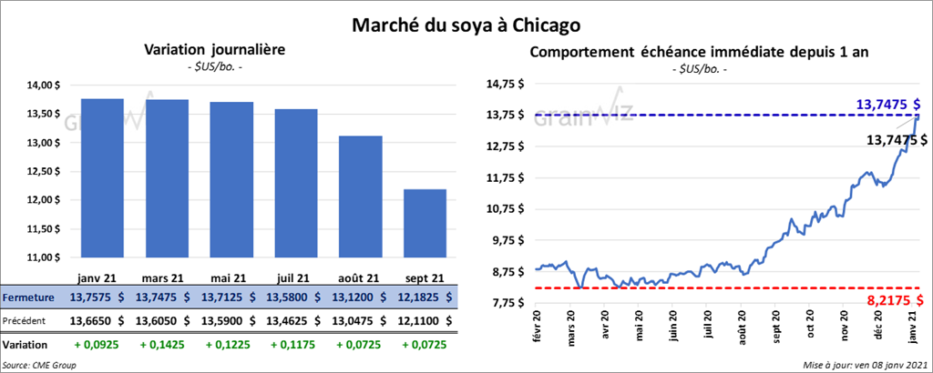 Les contrats de soya US aux échéances les plus rapprochées ont fini la journée en hausse entre 7 ¼ et 14 ¼ cents. Ceux de tourteau de soya US aux échéances les plus rapprochées ont également clôturé dans le vert entre 3,60 $ et 7,40 $/tonne. Les contrats d’huile de soya US aux échéances les plus rapprochées ont fini en baisse entre 6 et 20 points,